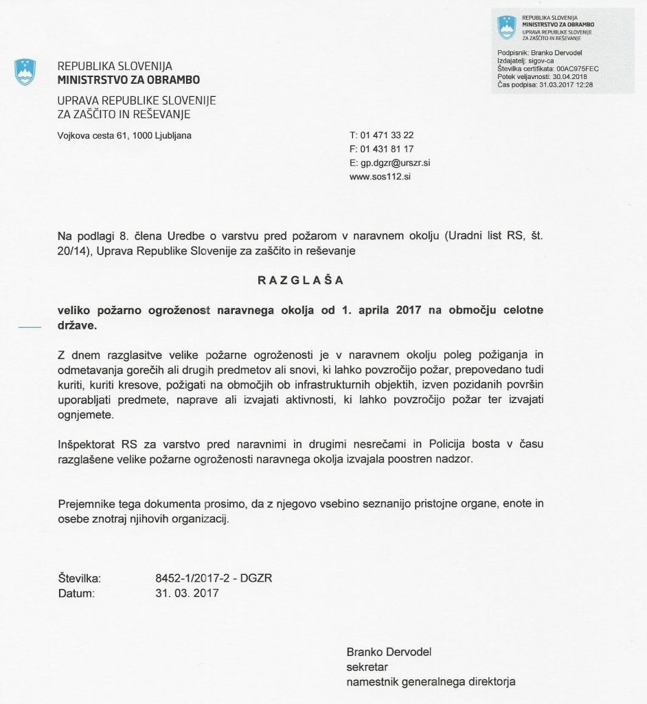 Takšne razmere bodo trajale do prvih obilnejših padavin, ki pa jih še ne pričakujemo. Uprava Republike Slovenije za zaščito in reševanje zato na podlagi 8. člena Uredbe o varstvu pred požarom v naravnem okolju (Uradni list RS, št. 20/14) s 1. aprilom 2017 razglaša veliko požarno ogroženost naravnega okolja na območju vse države.