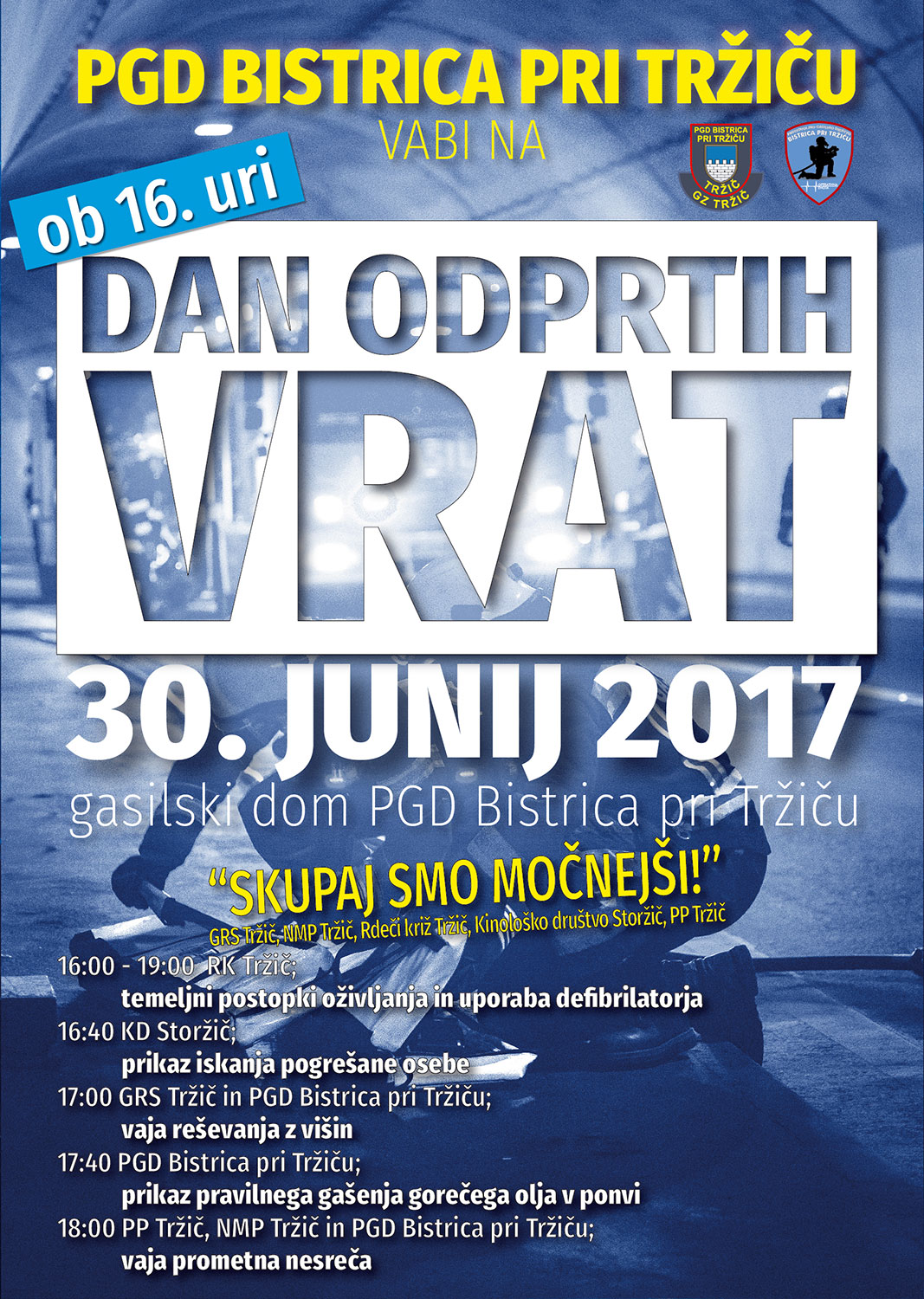 Letos se vam bodo na našem dogodku predstavile vse službe s katerimi sodelujemo. Sodelovali bodo člani KD Storžič z njihovimi štirinožnimi prijatelji, ki so izšolani za iskanje pogrešanih oseb, člani GRS Tržič s svojim vozilom in opremo, ekipa RK Tržič vas bo poučila o temeljnih postopkih oživljanja in uporabi avtomatskega defibrilatorja, ekipa NMP Tržič bo predstavila reševalno vozilo in opremo, policisti PP Tržič bodo na ogled pripeljali intervencijsko vozilo in nekaj njihove opreme, mi pa vam bomo seveda predstavili naše vozilo in opremo, ki jo uporaljamo za gašenje in reševanje. Da pa zadeva ne bo dolgočasna bomo skupaj izvedli tudi kakšno vajo in prikaz. Tudi letos pa se bodo otroci in mladi po srcu lahko posladkali s slastnimi palačinkami.