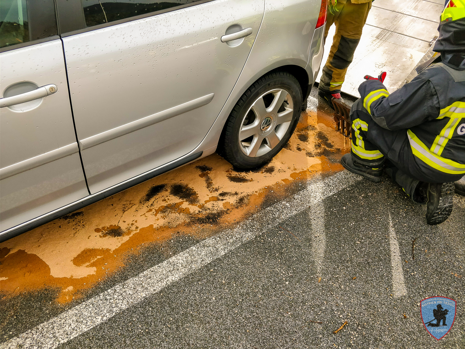 Na kraj smo odšli z GVC 16/25-T in skupaj z gasilci JZ GRS Kranj ugotovili, da olje teže iz pokvarjenega osebnega avtomobila. Razlito olje smo sanirali in preprečili nadaljnje onesnaženje.