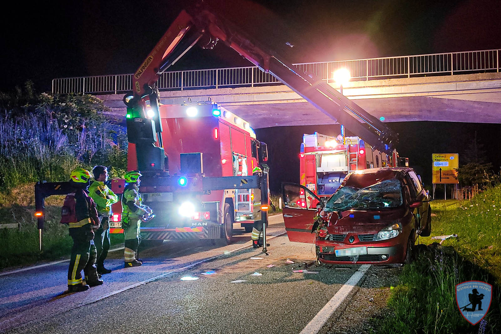 V nedeljo, 24. maja 2020, smo bili ob 23:54 obveščeni, da je osebno vozilo zletelo iz nadvoza in pristalo na strehi na spodnji cesti. Na kraj smo odšli z GVC 16/25-T, kjer smo skupaj z gasilci GARS Kranj prometno in požarno zavarovali kraj nesreče, odklopili akumulator na vozilu, vozilo postavili na kolesa, posuli razlite tekočine ter razsvetlili okolico.