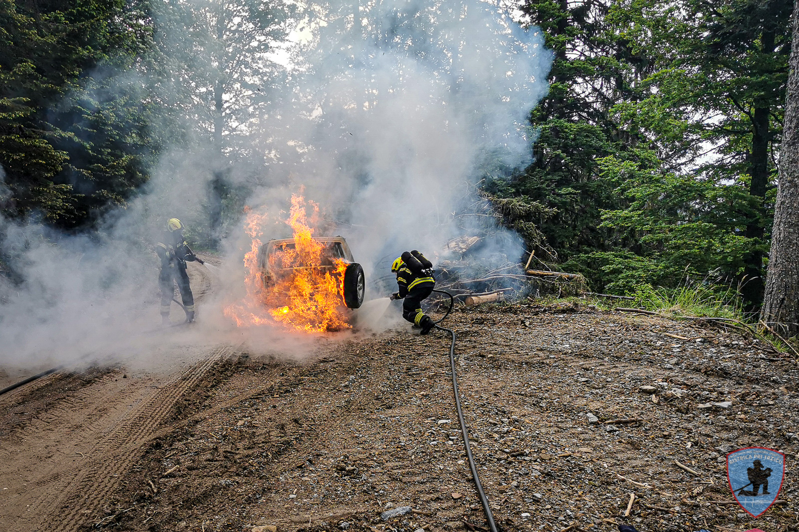 V nedeljo, 7. junija 2020, smo bili ob 10:35 obveščeni, da na poti proti Planini Pungrat gori terensko vozilo. Izvozili smo z GVC 16/25-T, GVC 24/50 in GVGP-2. Na kraju smo goreče vozilo skupaj z gasilci PGD Jelendol-Dolina in GARS Kranj pogasili z vodo in peno, ga pregledali s termokamero in s pomočjo vitla odstranili s cestišča.