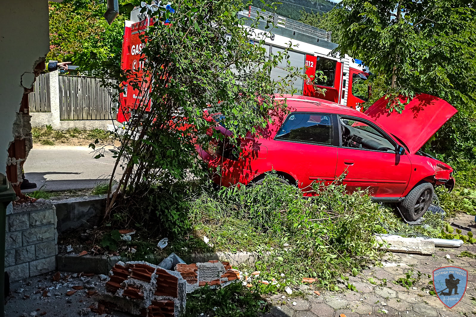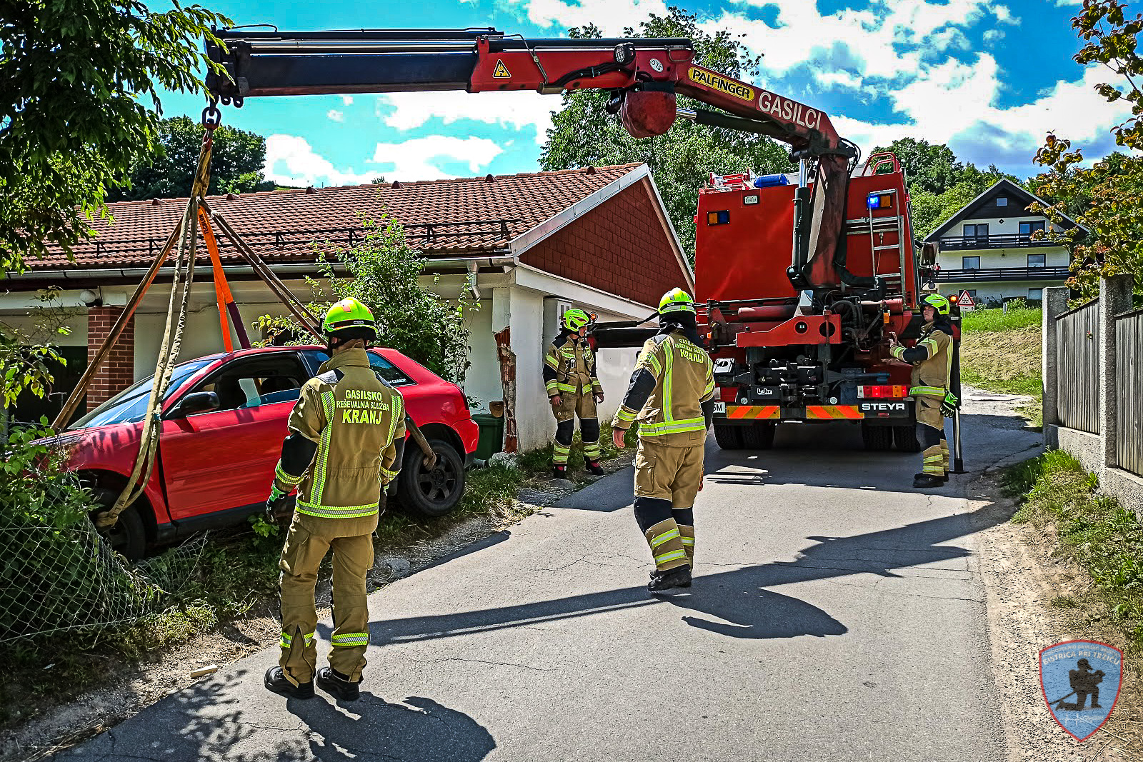 V torek, 23. junija 2020, smo bili ob 14:24 obveščeni, da se je na Loki zgodila prometna nesreča. Izvozili smo z GVC 16/25-T in na kraju ugotovili, da je osebno vizilo prebilo ograjo ob hiši in nasedlo na škarpo. Skupaj z gasilci GARS Kranj smo naredili prometno in požarno varovanje, odklopili akumulator ter z dvigalom vozilo dvignili in postavili na cesto