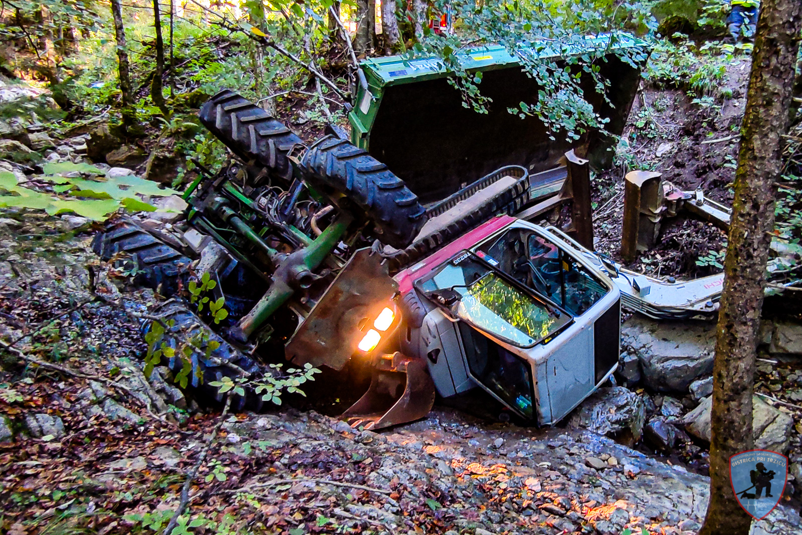 V torek, 20. septembra 2022, smo bili ob 8:18 obveščeni, da je v Jelendolu traktor s prikolico, na kateri je bil bager, zdrsnil v potok. Na kraj smo odšli z GVC 16/25-T in na kraju skupaj z gasilci GARS Kranj zavarovali kraj nesreče, vozila dvignili na cesto, odklopili akumulator in postavili bariero za lovljenje izteklih tekočin. V nesreči ni bil nihče poškodovan.