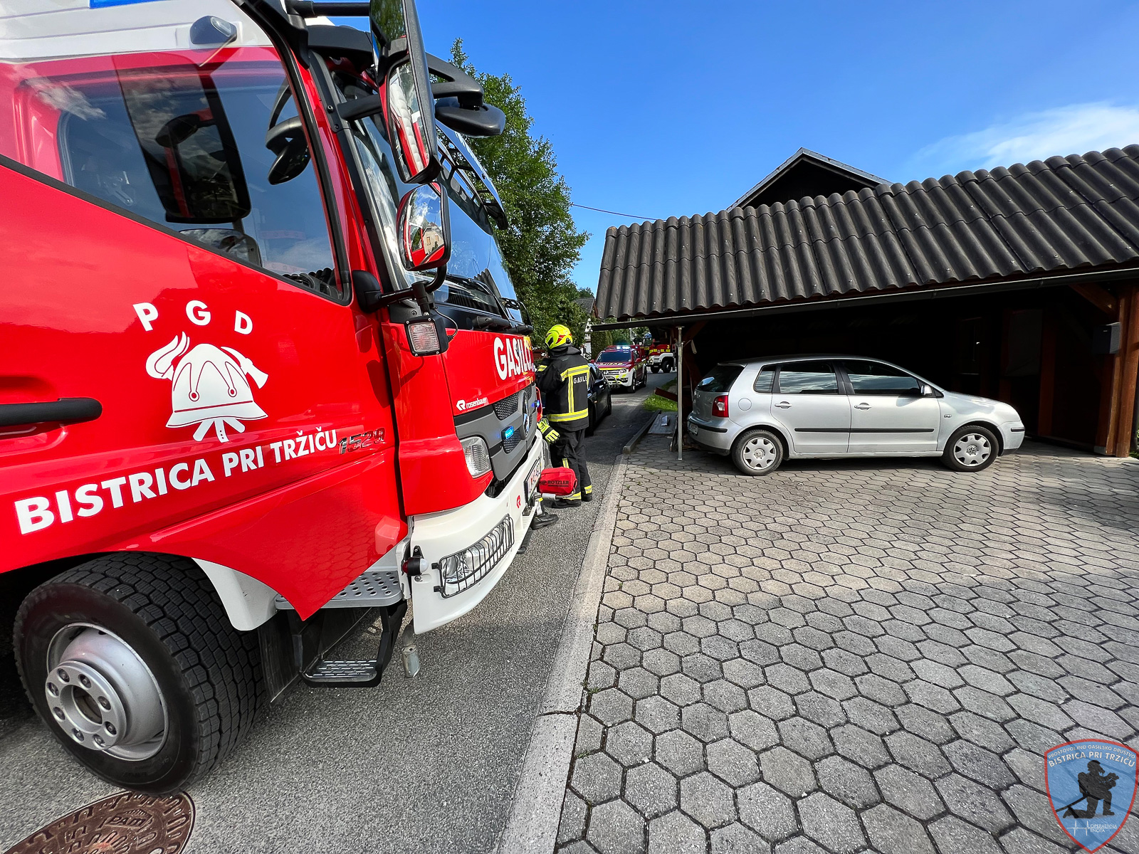 Na kraj smo izvozili z vozilom GVC 16/25-T, kjer smo skupaj z gasilci Gasilsko reševalne službe Kranj prometno in požarno zavarovali kraj nesreče. Po opravljenem ogledu kraja je bilo ugotovljeno, da je vozilo zapeljalo s ceste in se zaletelo v nadstrešek ob hiši. Del nosilne konstrukcije nadstreška se je pri tem porušil, zato smo nadstrešek zavarovali pred podrtjem ter počakali na policijo, ki je opravila ogled kraja. V nesreči ni bilo poškodovanih oseb.
