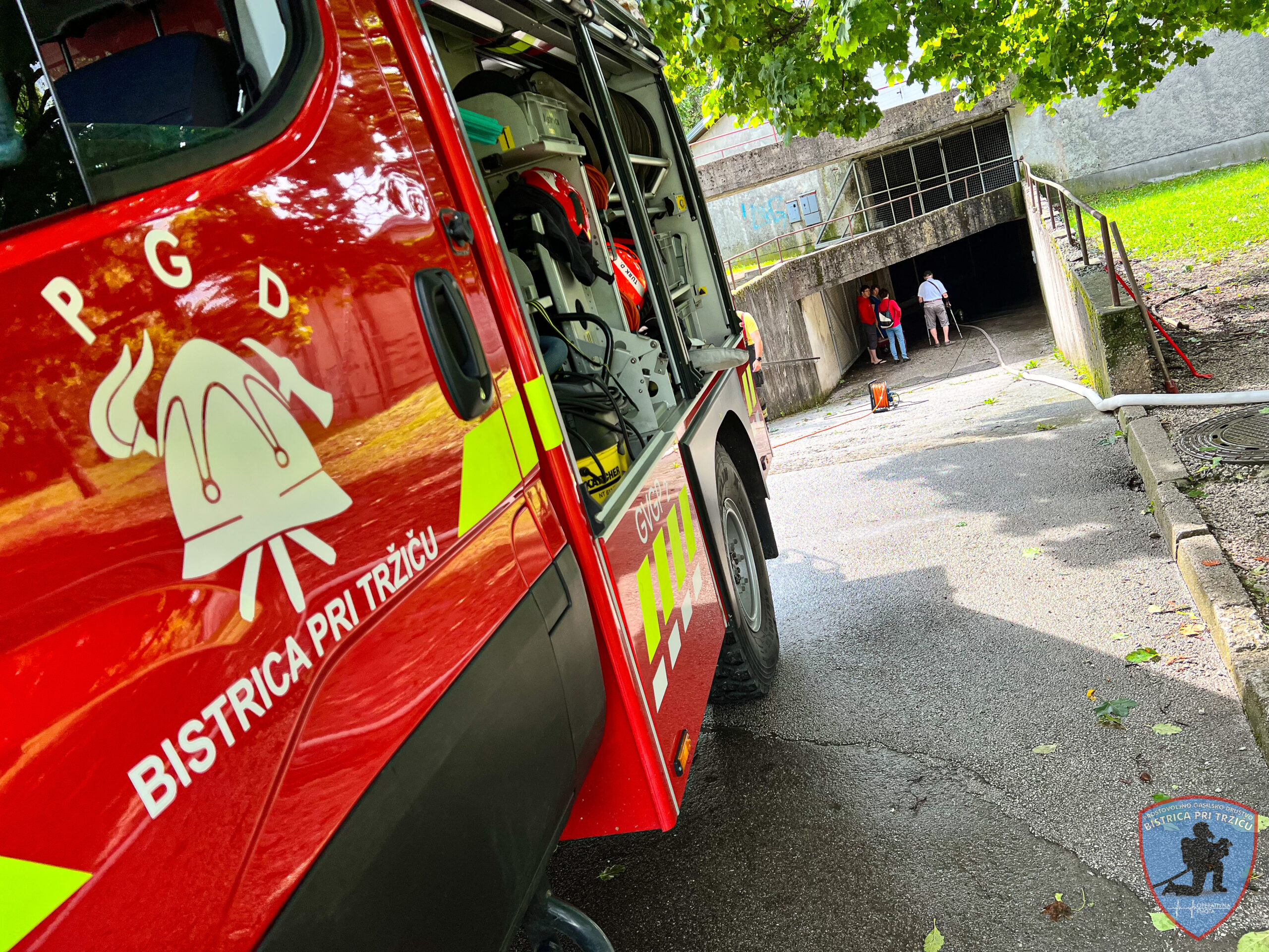 V torek 25.7.2023 smo bili dopoldan nekaj minut pred deseto obveščeni, da je ob močnejšem deževju voda zalila kletno etažo garažne hiše na Kovorski cesti v Bistrici pri Tržiču.
